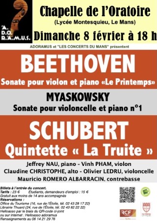 CALENDRIER 2025 cliquer pour agrandir SAMEDI 11 OCTOBRE 2025, 18 heures, LE MANS, Chapelle de l'Oratoire VIOLONS VIRTUOSES ! Direction : Dominique Fanal et Evelyne Béché Solistes : Vinh Pham, Aurelia Penalver-Smorawinska, Véronique Audoli, Elzbieta Lucas-Stolarz, Olivier Orient, Romain Renard, violons avec le concours de Gabriel Tempérault, piano (jeune pianiste sarthois) VIVALDI : « Le Printemps » et « L'Eté », extraits des « Quatre Saisons » Concerti pour 2 et 4 violons de « L'Estro Armonico » CHOPIN : Grandes pièces pour piano MASSENET : Le dernier Sommeil de la Vierge Méditation de Thaïs, pour violon et orchestre MOZART : Symphonie salzbourgeoise en fa majeur cliquer pour agrandir DIMANCHE 9 NOVEMBRE 2025, 16 heures, LE MANS, Salle des Concerts OMBRES ET LUMIÈRES Direction : Dominique Fanal Solistes : Valentina Diaz, piano - Diana Higbee, soprano K.-Ph.-E. BACH : Symphonie en si mineur MOZART : Concerto pour piano n° 23 Air de concert « Ch'io mi scordi di te », pour soprano, piano et orchestre CHAUSSON : Chanson perpétuelle, pour soprano, piano et cordes MILHAUD : Le Bœuf sur le Toit cliquer pour agrandir DIMANCHE 7 DÉCEMBRE 2025, 16 heures, LE MANS, Salle des Saulnières LES VOIX DE L'ÂME Direction : Dominique Fanal Solistes : Mireille Delunsch, soprano - Luc Orsini, hautbois - Vinh Pham, violon J.-S. BACH : Concerto pour violon et hautbois ALBINONI : Concerto pour hautbois MOZART : Air de concert « Non piu tutto ascoltai », pour soprano, violon et orchestre Jean FRANCAIX : Six Préludes pour cordes HAYDN : Cantate « Ariane à Naxos », pour soprano et orchestre cliquer pour agrandir DIMANCHE 8 FÉVRIER 2026, 18 h LE MANS, Chapelle de l'Oratoire MUSIQUE DE CHAMBRE Jeffrey Nau, piano - Vinh Pham, violon - Claudine Christophe, alto Olivier Ledru, violoncelle - Mauricio Romero, contrebasse BEETHOVEN : Sonate pour violon et piano « Le Printemps » MYASKOWSKY : Sonate pour violoncelle et piano n° 1 SCHUBERT : Quintette « La Truite »